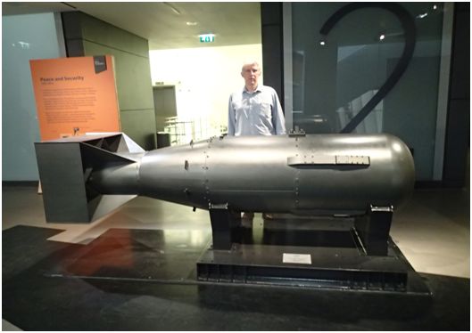 On the way to Kokura an alarm light started blinking – Fat Man was fully armed and ready to go off! At the rendezvous point two of the three planes circled for 45 min. waiting for the third plane. Kokura was blanketed in thick smoke. Flak started bursting. Due to the “purple operation” (Army pilot and Navy commander) a competence conflict broke out on board about what to do. The pilot was ordered to fly to the secondary target Nagasaki. Due to low fuel and clouds over Nagasaki the bombardier had only one chance to drop the bomb. He missed the target by 3 km. Bockscar just made it to Okinawa, the next possible Air base.