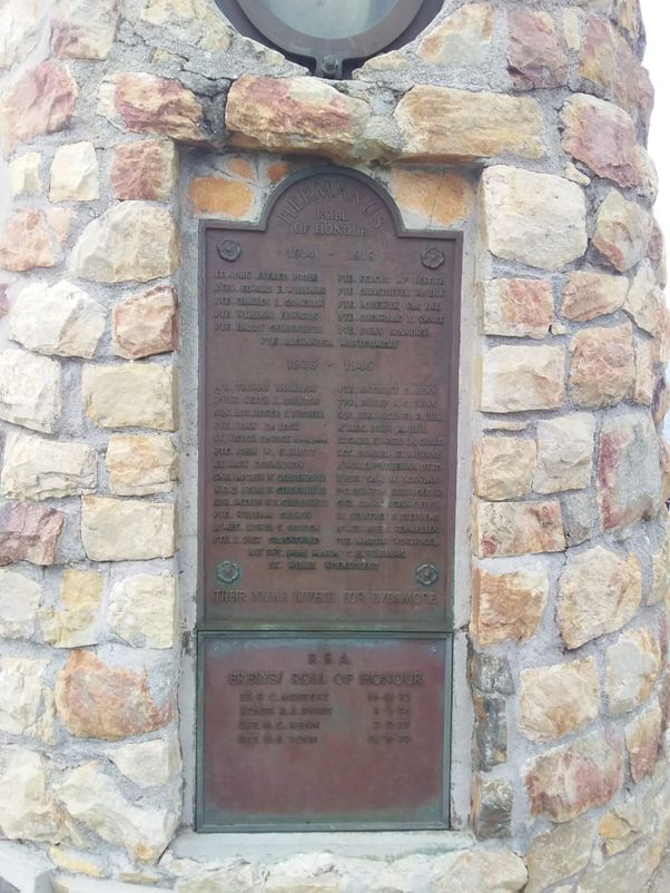 Plaques on the memorial record the names of Hermanus residents who died on both World Wars and on active service to the Republic of South Africa