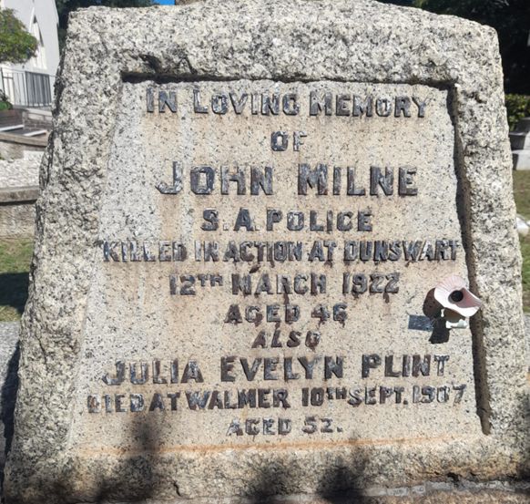 In Loving Memory of John Milne S.A. Police Killed in Action at Dunswart 12th March 1922 Aged 46