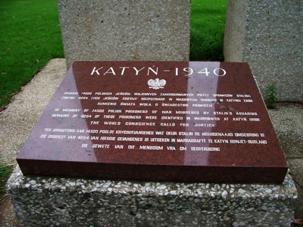 KATYN - 1940 IN MEMORY OF 14500 POLISH PRISONERS OF WAR MURDERED BY STALIN'S ASSASINS REMAINS OF 4245 OF THESE PRISONERS WERE IDENTIFIED IN MASSGRAVES AT KATYN USSR THE WORLD'S CONSCIENCE CALLS FOR JUSTICE