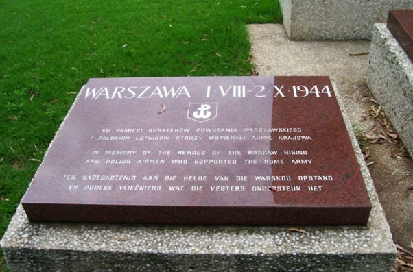 The inscription on the left panel reads WARSZAWA 1.VIII - 2. X.1944 IN MEMORY OF THE HEROES OF THE WARSAW RISING AND POLISH AIRMEN WHO SUPPORTED THE HOME ARMY