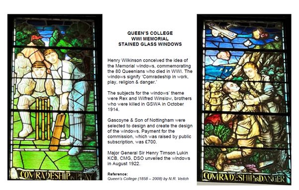 - Henry Wilkinson conceived the idea of the Memorial windows, commemorating the 80 Queenians who died in WWI. The windows signify "Comradeship in work, play, religion & danger."