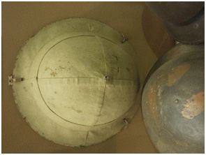 The standard paint colour used in 1940 was a light to medium green. The green colour paint used on the first South African armoured cars, is seen on one of the original helmets shown on the inside back cover of this issue. This paint colour was found and matched during the restoration of the South African Armoured Reconnaissance Car Mk 1 (Ford) carried out at the Ditsong National Museum of Military History in 1990. An unfinished helmet in the same colour was also discovered in the Museum store, suggesting a more widespread use. It is not known if all of the original 60 000 pressed helmets were painted in this colour though it seems probable. After spray-painting, the helmets were sent to Jager Rand Ltd for the fitting of the liners.