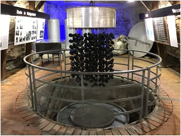 Repeatedly pointing out the theoretical possibility of an atomic bomb to official authorities allowed them to maintain the status of their research as “important to the war effort” and to classify the scientists involved as “indispensable”, meaning they were not required to go to the front. Incidentally, the uranium project also enabled them to revalue or rehabilitate modern theoretical physics, especially quantum physics and the theory of relativity, which the Nazis viewed as Jewishly degenerate. From 1943 onwards, the relocation of research facilities scattered throughout the Reich, shortages of materials and disputes over competence increasingly delayed the work of the researchers. At the beginning of March 1945, the last reactor experiment took place in Haigerloch, Southern Germany. The reactor consisted of 1.5 t uranium, 1.5 t heavy water (as a moderator) and 10 t graphite (as a neutron reflector).