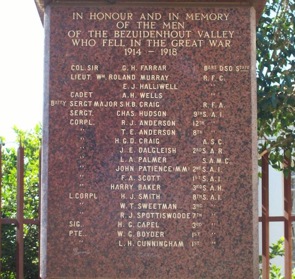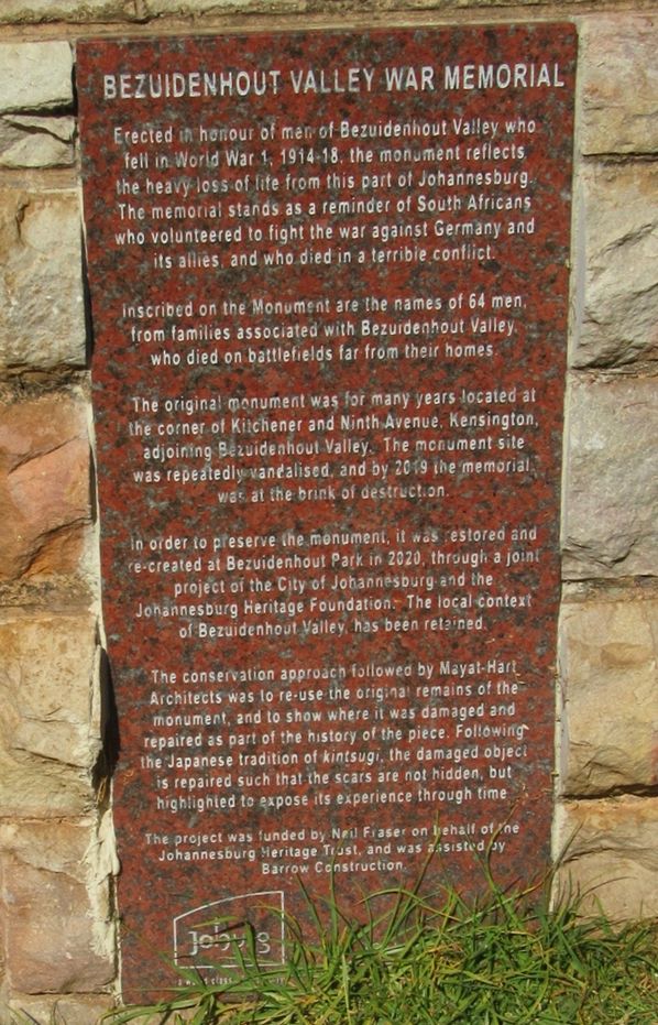 The Memorial is dedicated to the 64 men of the Bezuidenhout Valley who fell in the Great War 1914-1918.