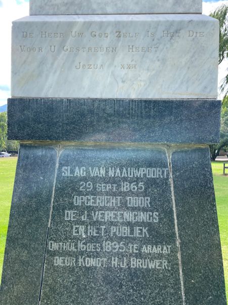 During escalating territorial conflict between the Basotho and the Boer Republics, a Transvaal commando was sent to clear the Basotho from the highlands. On 29 September 1865, 5 burghers were killed in a Basotho surprise pre dawn attack on this commando near present day Clarens. A counter attack drove the Basotho back through Naauwpoort Nek. The fallen burghers were buried on the battlefield.