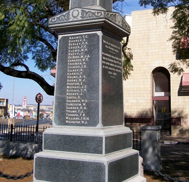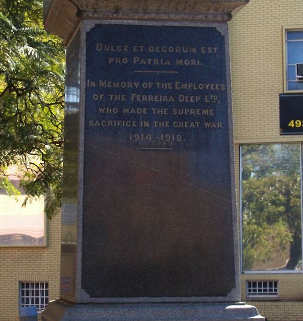 The Memorial is "In Memory of the Employees of the Ferreira Deep Ltd who made the Supreme Sacrifice in The Great War 1914-1918." This is repeated in Afrikaans on another panel.