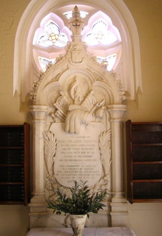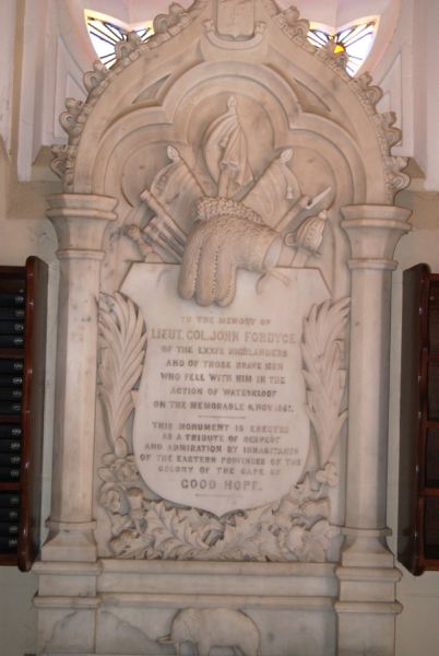 IN MEMORY OF LIEUT COL JOHN FORDYCE OF THE LXXIV HIGHLANDERS AND OF THOSE BRAVE MEN WHO FELL WITH HIM IN THE ACTION OF WATERKLOOF ON THE MEMORABLE 6 NOV 1851 THIS MONUMENT IS ERECTED AS A TRIBUTE OF RESPECT AND ADMIRATION BY INHABITANTS OF THE EASTERN PROVINCES OF THE COLONY OF THE CAPE OF GOOD HOPE