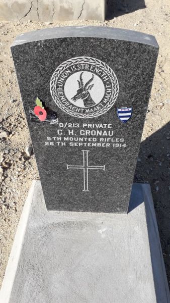 When I visited the South African War Graves in Luderitz, Namibia, I recognised that Private Gronau's name is on the Grey High School War Memorial. I placed a school badge on his grave during my next visit.