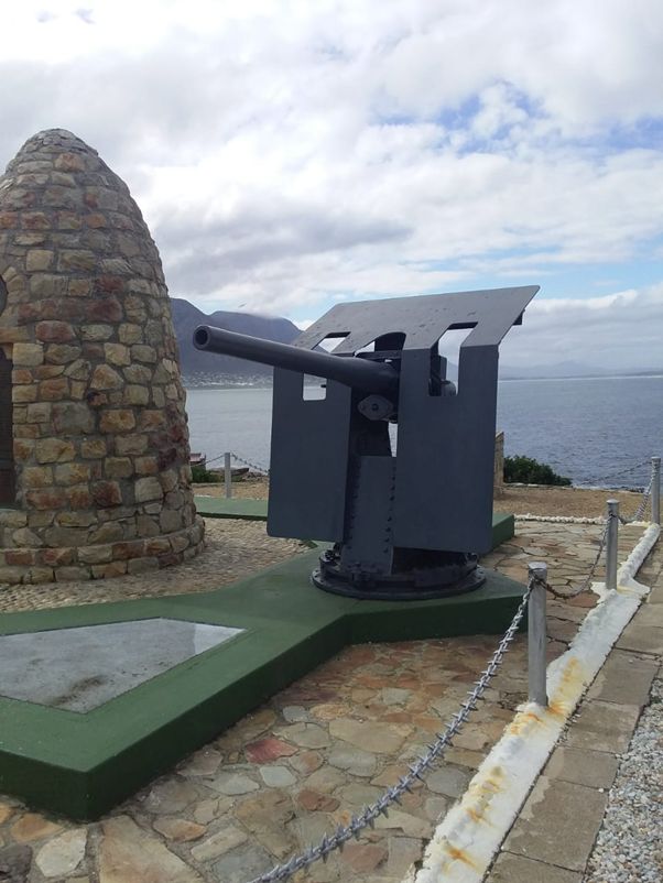 The guns on the Hermanus War Memorial are both 12-pdr 12 cwt Mk IX (High Angle) guns. Of UK origin, the type was initially designed for close harbour defence against small fast warships but was adapted for use in multiple roles. Besides their initially intended role, they were mounted on armed merchant ships and on SAN small warships such as SAS Somerset. They had a range of 10 000 yards and a firing rate of 15 rpm. These two guns were both manufactured in 1942. Identifiable numbers on them are ADM 2818 and ADM 2822. Although these two guns are not in good condition, there are 11 others of this type in South Africa, some in excellent condition.