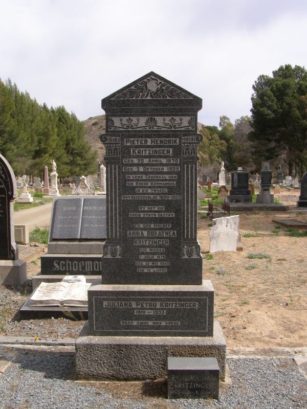 General P.H. Kritzinger joined the Rouxville Commando at the beginning of the Anglo-Boer War. He was promoted to General in April 1901. He was regarded as one of the effective leaders of the guerilla phase of the War. He was wounded and captured in March 1902. He was tried for actions during the War and was acquitted on all counts. After the War, he raised funds overseas for Christian National Education. He became a member of the Cape Provincial Council in 1929. He died in 1935.